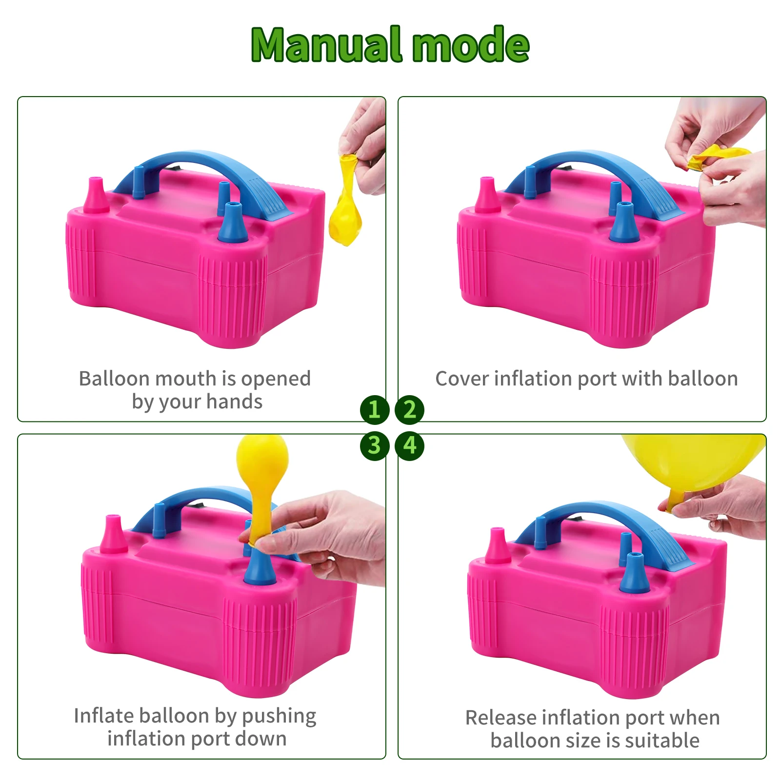 Manual Mode/Automatic Mode: Simple and flexible operation on this balloon air pump. Operation 1, cover the inflation port with the balloon, then press the inflation port slightly to inflate the balloon and release the inflation port to stop. Operation 2: Press the black switch on, then cover the inflation port with balloon to inflate; When inflating with operation 2, it is unnecessary to press the inflation port.