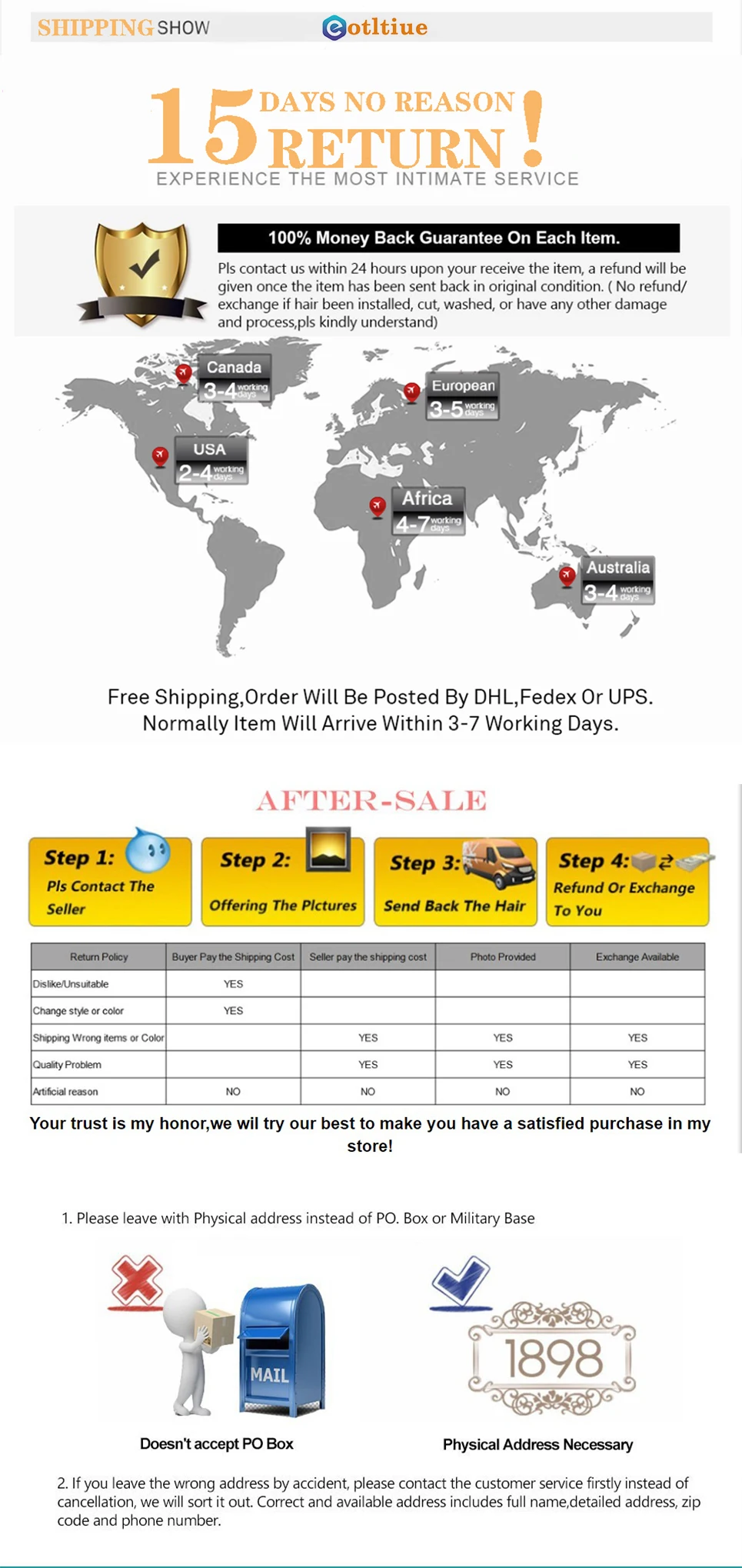 If your order is not with the “Free Return” service, Please keep hair in its original states and contact us in time. We will send you the return shipping address. Except for the quality problem because the buyer for Return & Refund, the shipping cost needs to be paid buyer. We will extend the processing time for your order and after the package arrives, we will refund all your money.