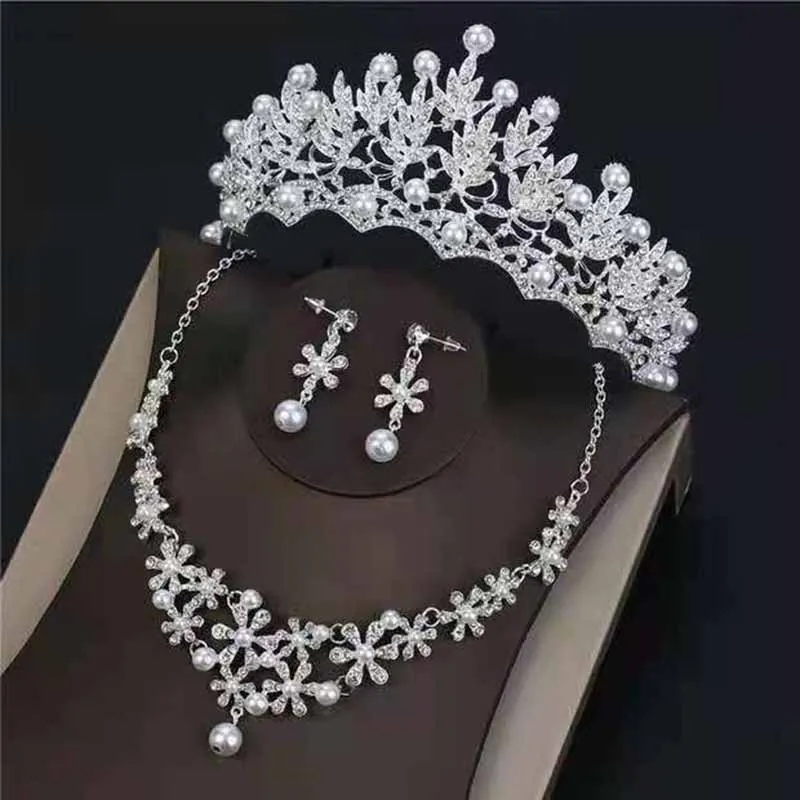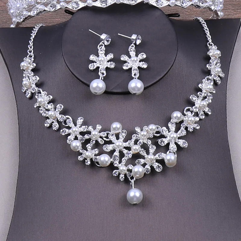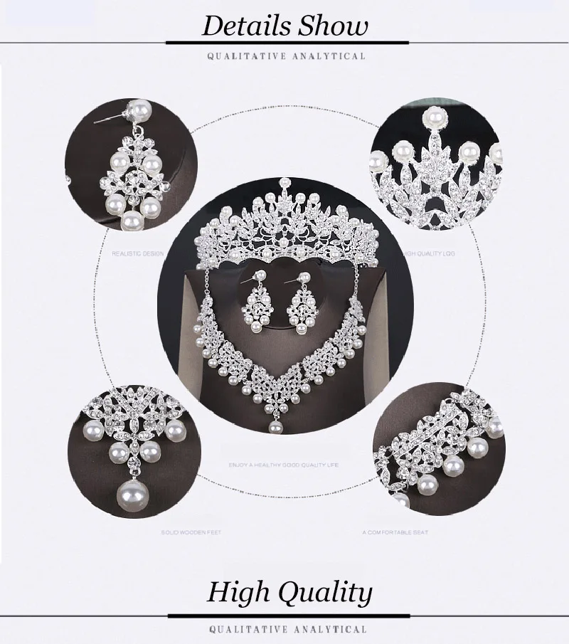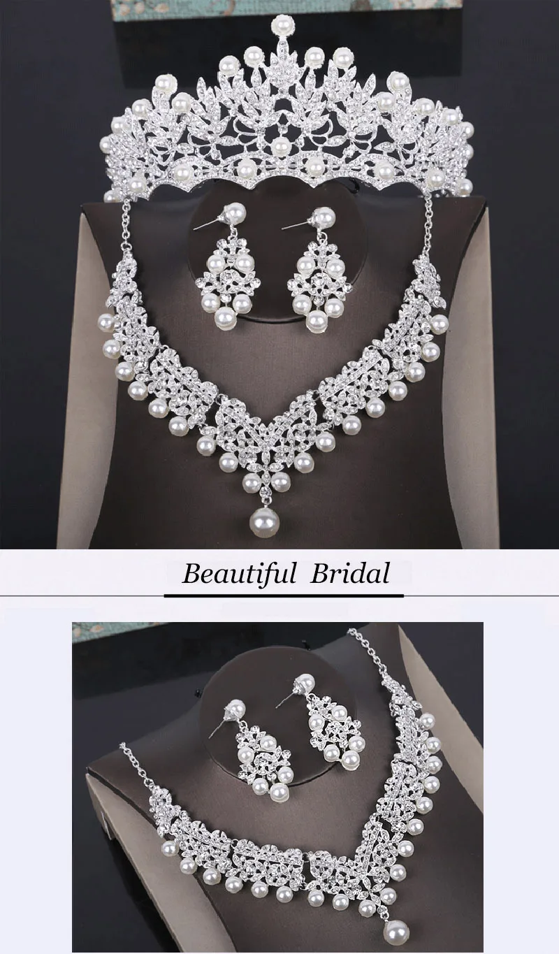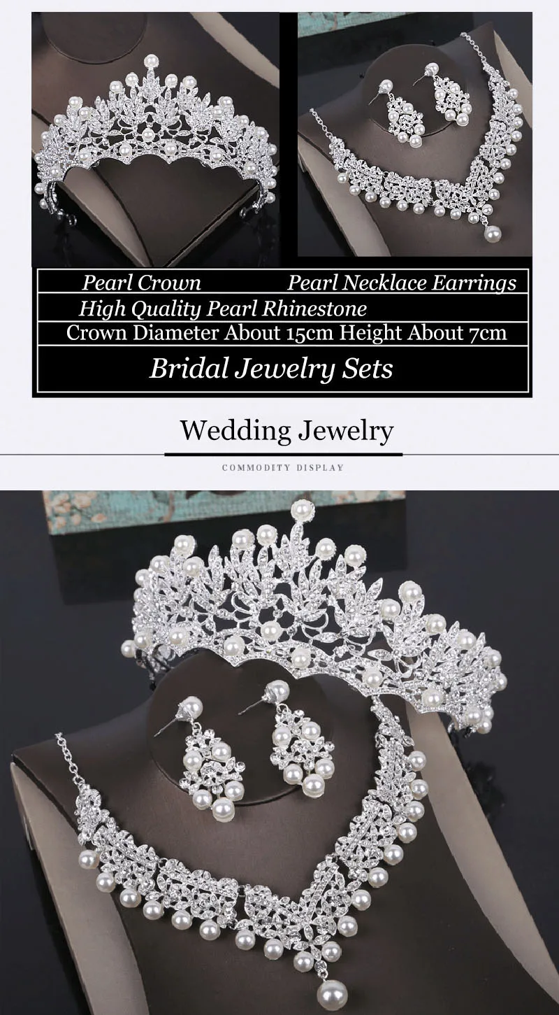 Crystal Bridal Jewelry Sets Pearl Necklace Earrings Crowns Sets